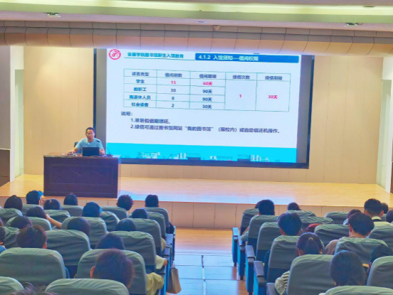 段昌华通过多媒体生动形象的为新生们展示图书馆在各高校的作用,向新生们讲解了图书借阅流程、电子资源检索技巧、借阅规则与期限,并强调了入馆要求。图书馆作为我校的文献信息资源中心和学习交流平台,在高校人才培养、科学研究、社会服务、文化传承创新方面有重要作用;同时也是学生“第二课堂”的重要组成部分,肩负着文化育人的重要使命。新生入馆教育不仅仅是新生走进图书馆的“第一堂课”,也是学院落实“三全育人”的重要举措。