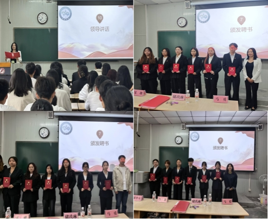 随后党总支书记储玖琳老师为新一届主席团成员颁发了聘书;马勇老师和邹珊老师为各部门新任部长颁发了聘书。