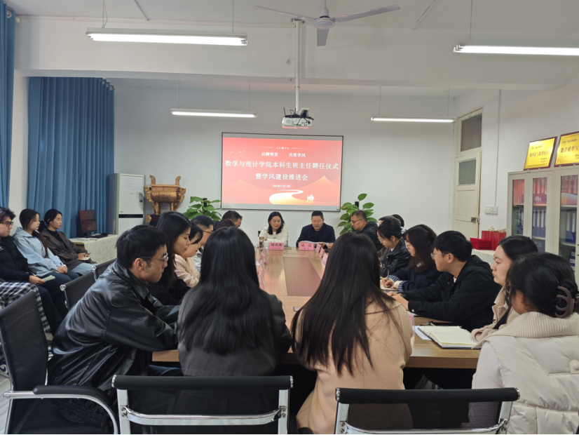 为落实立德树人根本任务,深化“三全育人”机制,2025年11月13日,数学与统计学院本科生班主任聘任仪式暨学风建设推进会在2207举行。学院领导班子、全体班主任、辅导员及24级、25级班长齐聚一堂,共话育人职责,共商学风建设,会议由杨高翔主持。