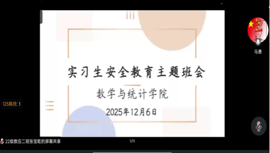 为切实增强2026届实习生的安全意识,保障实习期间人身与财产安全,特别是在当前实习学生分布广泛、实习环境多样的背景下,数学与统计学院于12月6日晚召开了线上安全教育主题班会。本次班会由毕业班辅导员马勇老师主持。