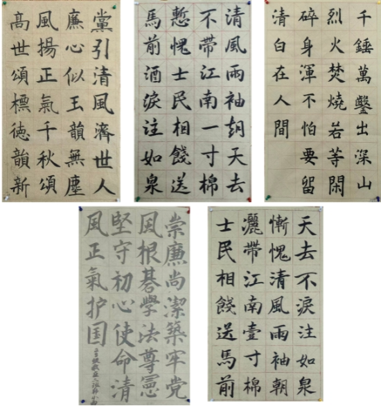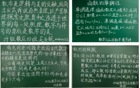 比赛分为钢笔、粉笔和毛笔三个组别,吸引了全院近百名学生积极参与。参赛作品主题鲜明,既有对法治精神的深刻诠释,也有对廉政文化的生动表达,更不乏将数学公式、数学思想与中国传统书法艺术相结合的创新之作。其中法治主题作品以宪法条文、法治格言为内容,笔锋刚劲有力,体现了数学人严谨守法的精神追求;廉政文化作品通过古代廉吏诗词、现代廉政警句,以翰墨清香传递清风正气,展现了学院廉洁育人的教育理念;数学文化创作成为本次活动亮点,参赛者将数学公式、数学定理、数学家名言与传统书法艺术巧妙融合。欧拉公式、勾股定理等数学元素在宣纸上跃然而出,既体现了数学之美,又展示了传统文化的魅力。