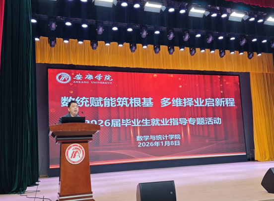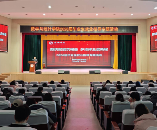 为扎实推进2026届毕业生就业指导与服务工作,引导学生明确职业方向、提升就业竞争力,2026年1月8日,数学与统计学院举办2026届毕业生就业指导专题活动。副院长徐龙华、就业指导中心师帅老师、山香教育周老师、全体学工团队以及2026届、2027届共400余名学生参加活动,活动由就业办主任邹珊主持。