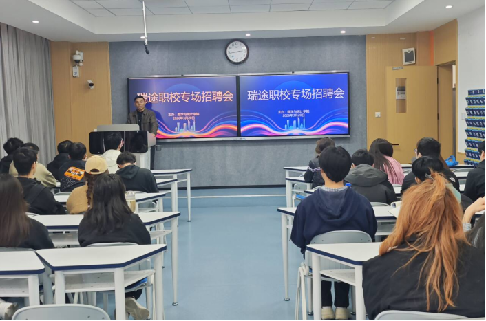 为切实做好毕业生就业工作,拓宽就业渠道,搭建毕业生与用人单位双向选择的优质平台,3月20日,数学与统计学院在1305教室举办瑞途职校专场招聘会。招聘会由毕业班辅导员马勇主持。